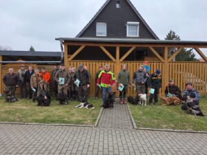 Die JP der LG 13 am 21./22.03.2026 fand in Hayn/ Straßberg statt. Für die Hasenspuren nutzten wir verschiedene Reviere im Südharz, Nordharz und Erfurter Becken, erfreulicherweise konnten wir erstmals Hasenspuren im Bereich Schwanebeck prüfen, hierfür recht herzlichen Dank für die Organisation vor Ort an unserer LG-Mitglied Danilo Hildebrandt. In allen Revieren fanden wir gut- und weiteinsehbare begrünte Flächen vor, der Hasenbesatz war optimal. So konnten die Spurarbeiten zügig abgeschlossen werden. Bodenfeuchtigkeit war nicht vorhanden, leichter Morgentau hielt bis zum späten Vormittag. Die restlichen Fächer prüften wir in der Gräflich Ortenburg´schen Forstverwaltung. Vielen Dank an das Feriendorf Forsthaus Auerberg für die Übernachtungsmöglichkeit. Von 16 erschienen Hunden konnten 15 durchgeprüft und prämiert werden, leider musste ein DW aus gesundheitlichen Gründen zurückgezogen werden. Vielen Dank an die Revierinhaber und die eingesetzten Richter. Insgesamt eine harmonisch verlaufende Prüfung bei der der Richteraustausch nicht zu kurz kam.